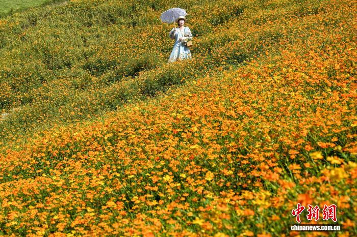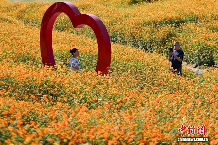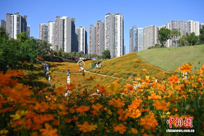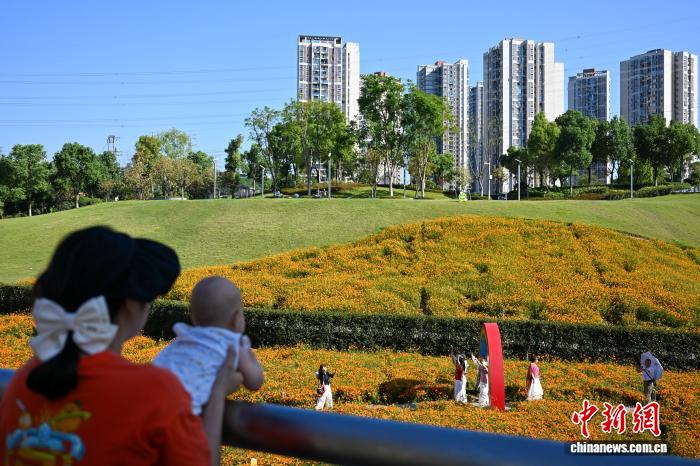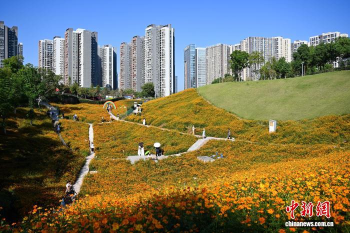 10月10日,市民在重庆溉澜溪体育公园赏花、拍照。近日,重庆江北区溉澜溪体育公园内硫华菊迎来盛花期,金黄花海在秋日阳光下格外夺目,市民漫步其间赏花拍照,尽享城市中的自然之美。中新社记者 何蓬磊 摄