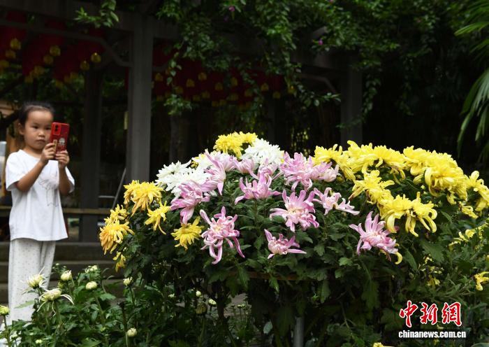 10月7日,2025年重庆鹅岭公园菊展吸引小朋友参观拍照。中新社记者 周毅 摄